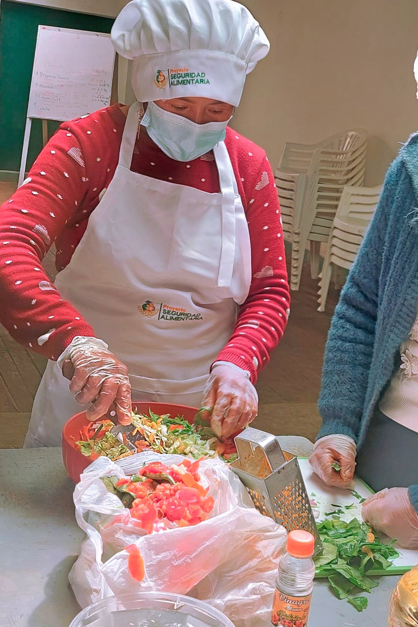 Durante la actividad, la profesional en nutrición del proyecto, Lic. Claudia Chavez Hinojosa, enseñó a preparar pollo al maní, pastel de espinaca, suspiro de zanahoria y néctar de beterraga, resaltando sus beneficios y la importancia de incluir las hortalizas en la dieta diaria para prevenir la anemia y la desnutrición infantil.