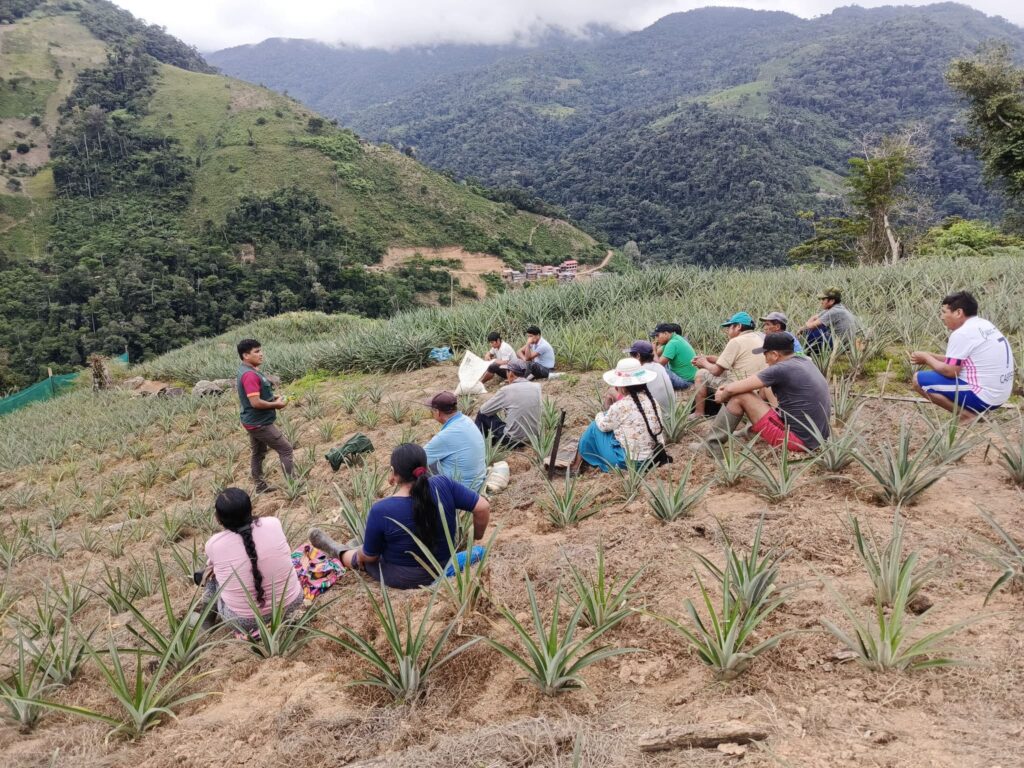 En el distrito de San Pedro de Putina Punco, la Escuela de Campo de Pampa Grande, ubicada en el sector Ramosani, fue escenario de una sesión práctica sobre abonamiento en el cultivo de piña de la variedad Golden MD2.
