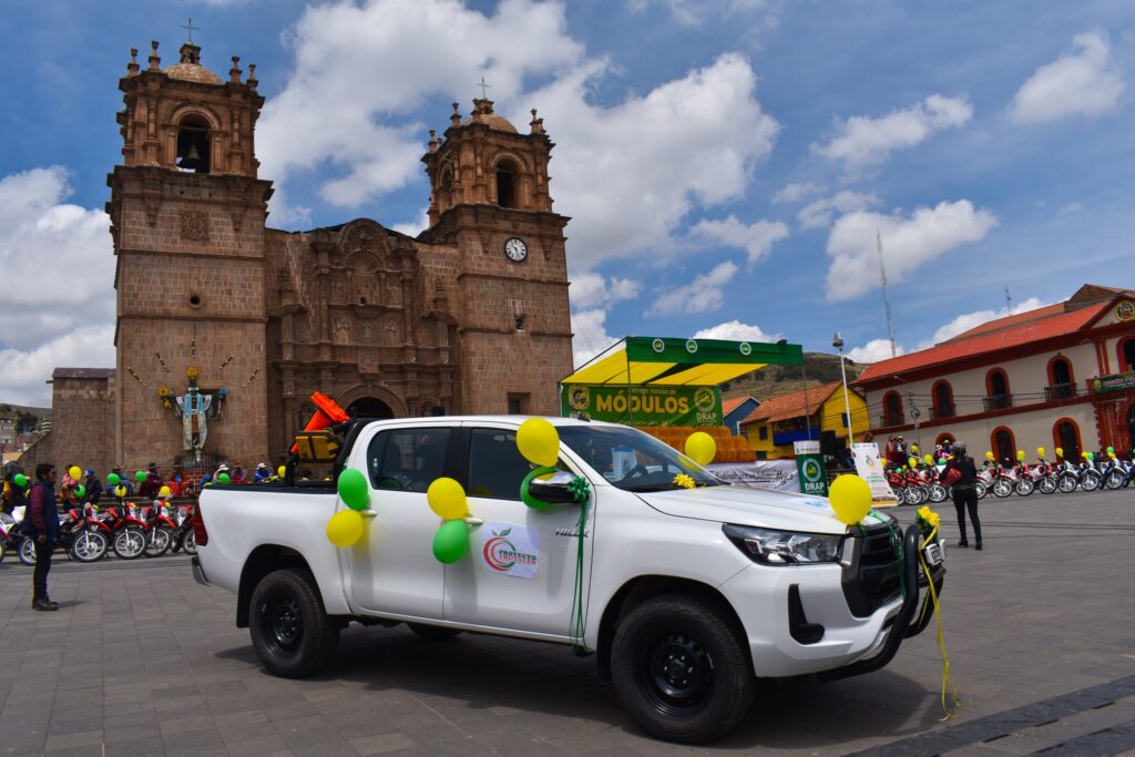 El Proyecto Frutales entregó 31 motos, 1 camioneta y el Proyecto Vicuñas entregó 62 mallas ganaderas de 12 hilos. Este jueves 21 de diciembre se realizará la entrega en la Agencia Agraria San Román, el viernes 22 en la Porvincia de Chucuito Juli y el sábado 23 en San Antonio de Putina.