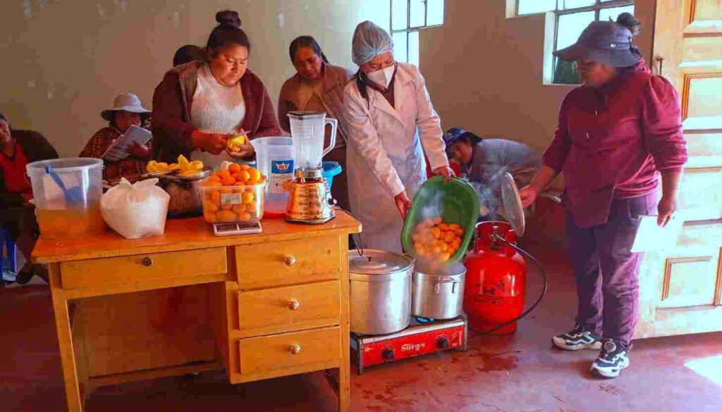 En la escuela de campo Cantani, en Ayapata, los agricultores se animaron a dar un paso más: convertir su sacha tomate y papayita andina en néctares y mermeladas listas para el mercado y el consumo familiar.